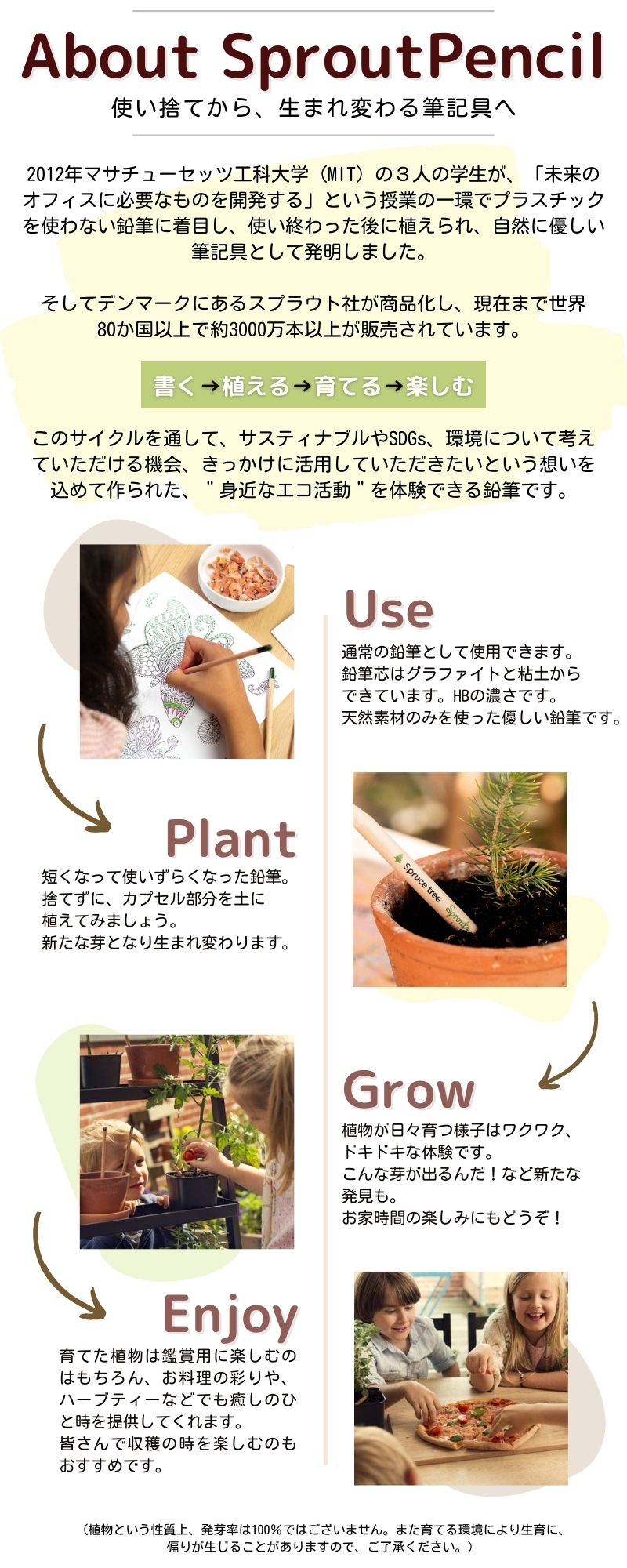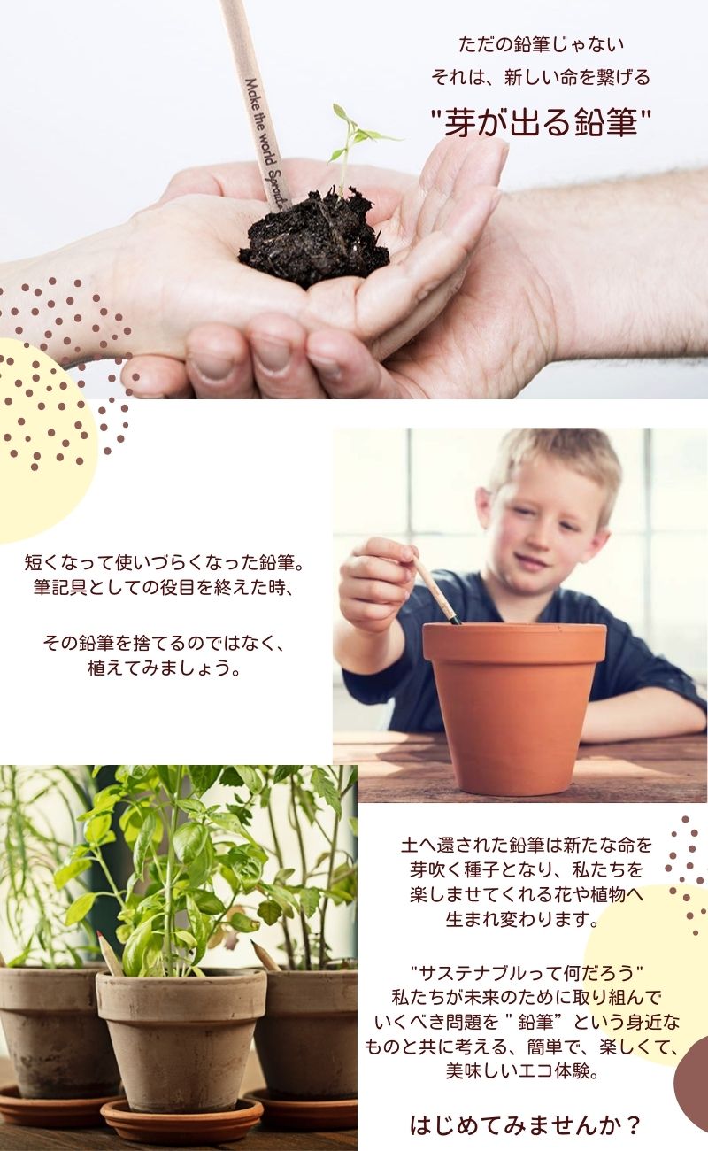 短くなって使いづらくなった鉛筆、、、筆記具としての役目を終えた時、その鉛筆を捨てるのではなく、植えてみましょう。土へ還された鉛筆は新たな命を芽吹く種子となり、私たちを楽しませてくれる花や植物へと生まれ変わります。
