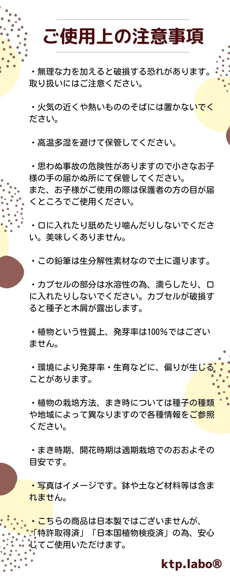 ・カプセル部分は水溶性の為、濡らしたり、口に入れたりしないでください。カプセルが破損すると種子と木屑が露出します。