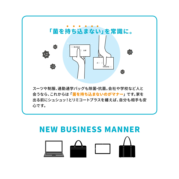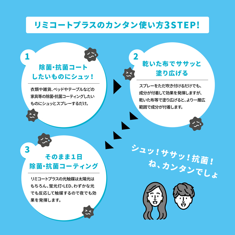使用方法:匂いや菌、ウイルス等の付着が気になる部分や対象物に直接噴射してください。