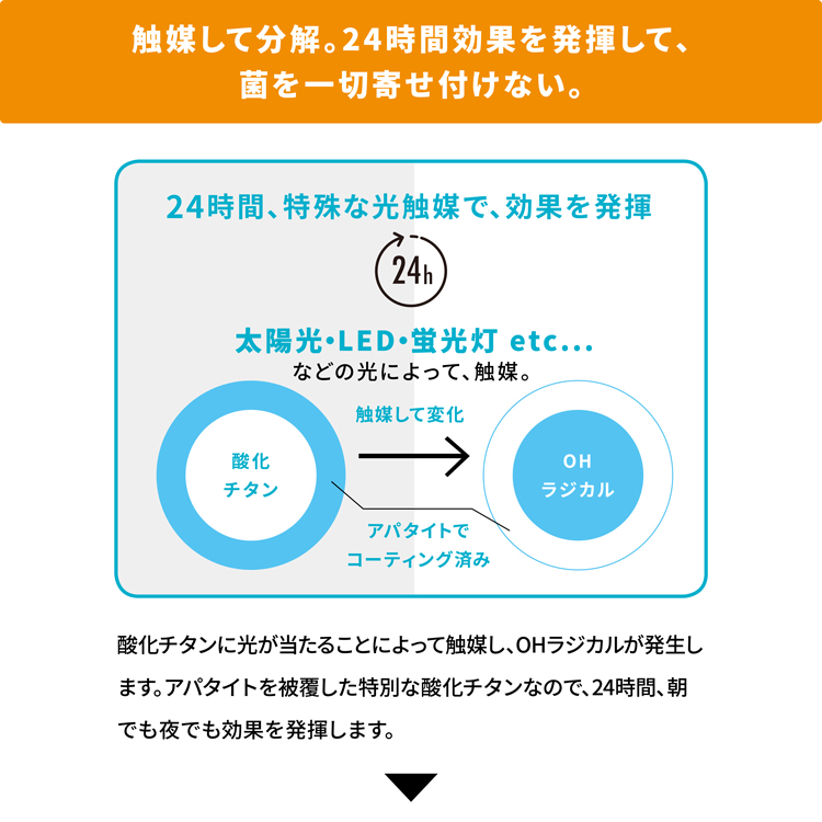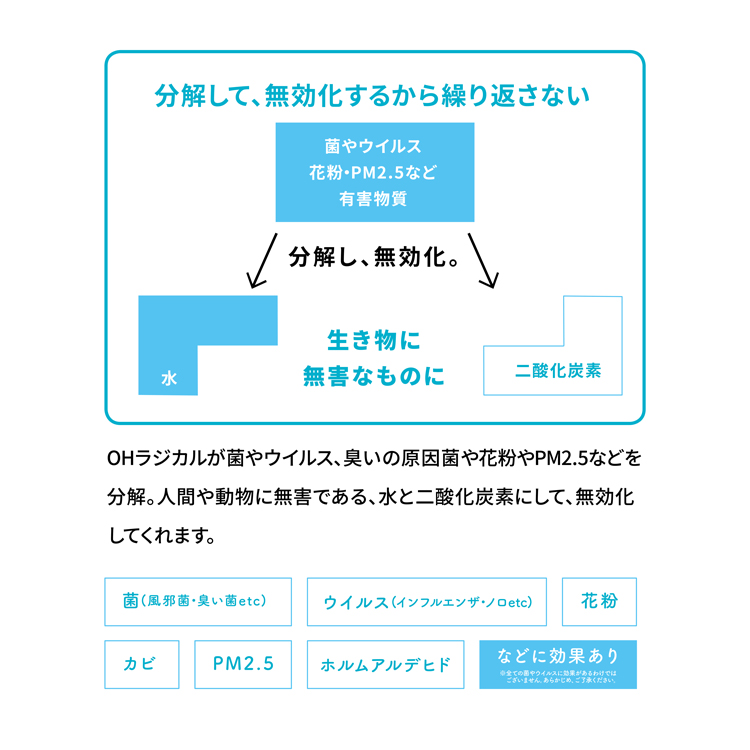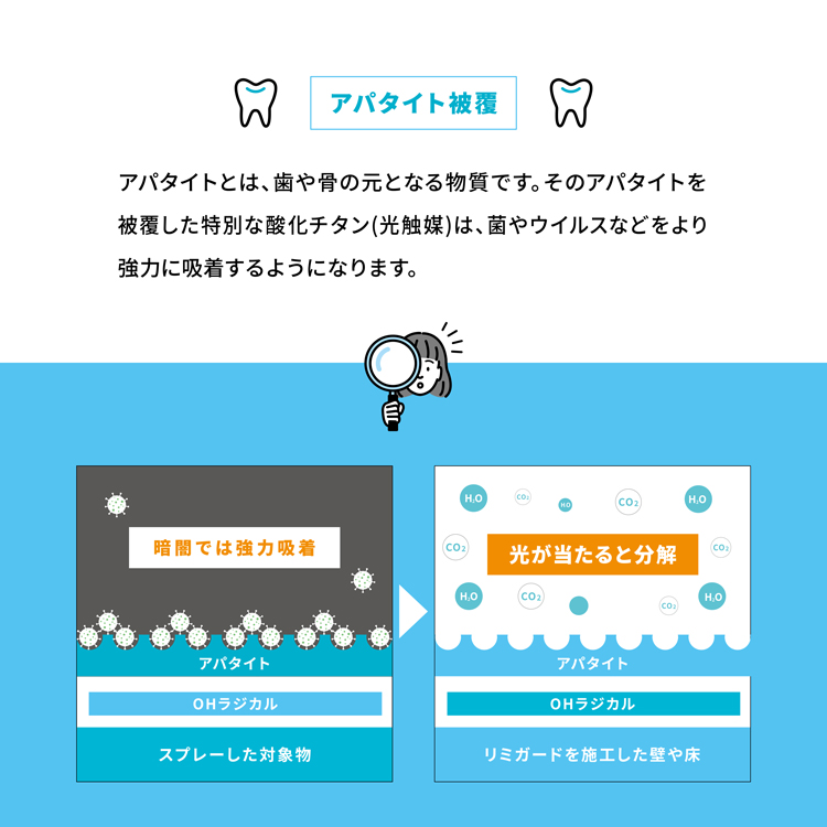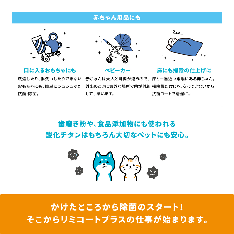 新技術光触媒により、ウイルス・匂い・細菌などの有機物を分解・除去します。高い抗菌力と持続力で消臭除菌が長時間発揮できますので、ご家庭、事務所、飲食店、車両などで除菌・抗菌処理として幅広くお使い頂けます。また、成分は天然由来成分のみとなります。着色料、香料、防腐剤、界面活性剤を一切使用せず、無添加、無香料なので、小さいお子様やペットがいるご家庭でも安心してお使い頂けます。