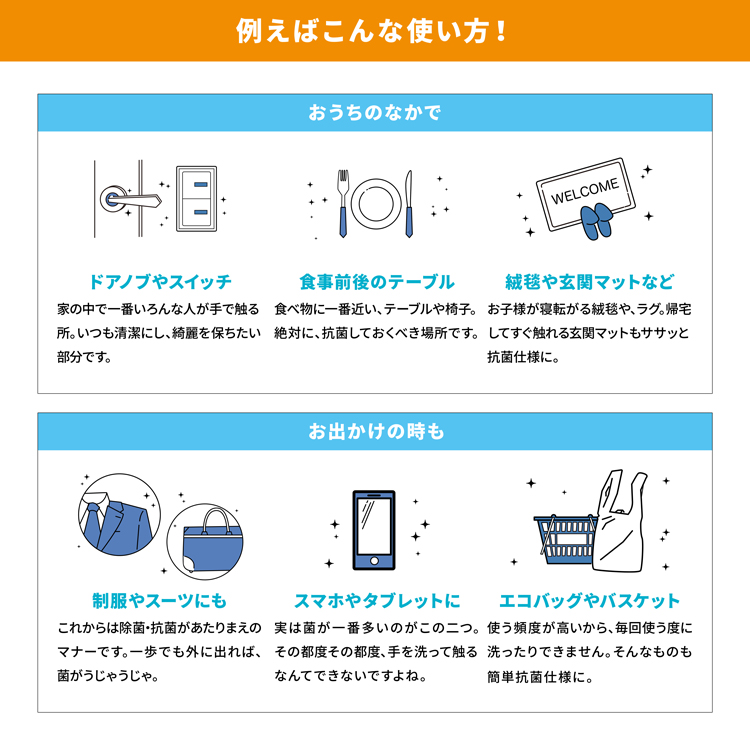 用  途:布製品(カーペット、ソファー、カーテン等)、マスク、衣類、車内(シート、ハンドル等)、室内(ドア取手、雑貨、家具等)、乳幼児用品、ペット用品等の抗菌及び消臭