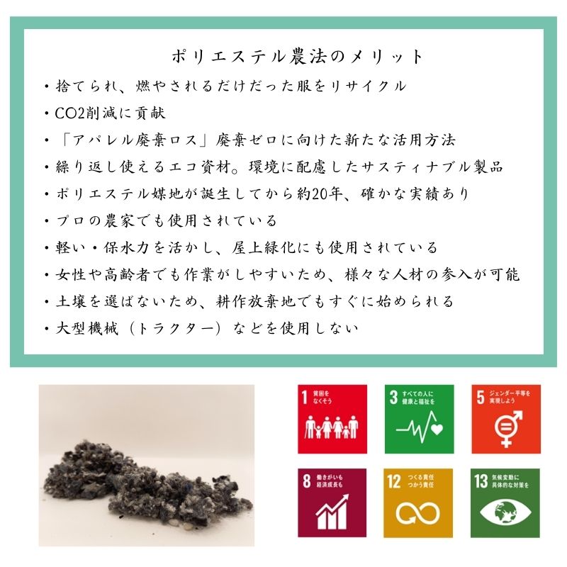 捨てる服から生まれた「かんたん」「かるい」「よごれにくい」「バツグンの保水力」が特徴。繰り返し使えるエコな新素材である「生産革命(ポリエステル媒地)」を使ってみませんか? |